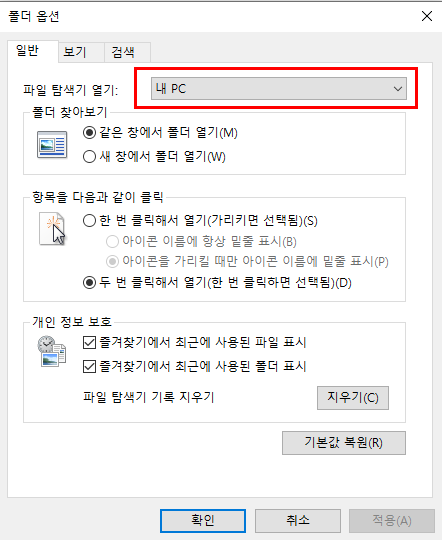 [폴더 및 검색옵션]에 들어가면 위와 같은 창이 뜨게됩니다. 위 창에서 [파일탐색기 열기]를 [내 PC]로 변경해주시고 작업관리자(Ctrl+Alt+Del)를 들어가서 windows 탐색기 -> 다시시작을 눌러주시면 CPU 점유율이 내려가기 시작합니다.