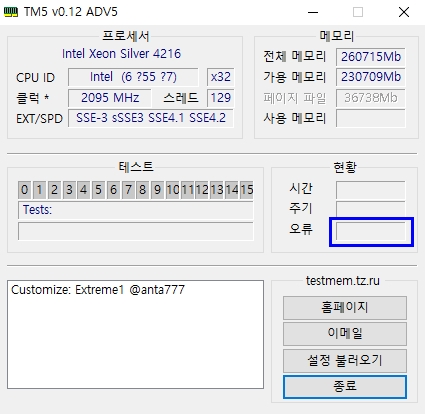 보통은 메모리 사용율이 95%정도되면 정상작동으로 보고, 메모리 점유율이 높기때문에 재부팅 후 아무작업도 하지 않은 상태로 TM5만 실행하시는 것을 권장드립니다. 추가적으로 Hwmonitor라는 프로그램을 통해 부품들의 온도도 함께확인하는 것을 권장드립니다.